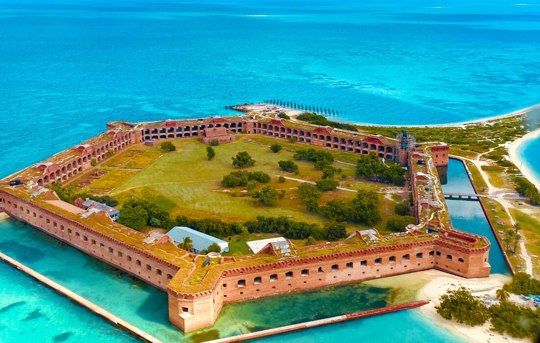 O parque nacional de Dry Tortugas é impactante. Nele, o Fort Jefferson, uma fortaleza do século 19, parece flutuar em meio ao mar turquesa, a cem quilômetros da costa de Key West.