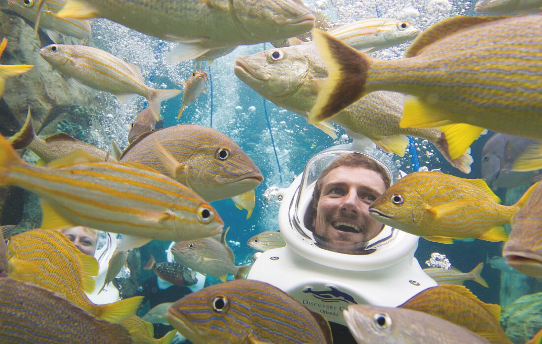 Já o Discovery Cove é como se fosse um clube all-inclusive para passar o dia. Além de piscinas e praias artificiais, tem também aviário, nado com golfinhos, snorkel e a experiência SeaVenture, em que os visitantes caminham embaixo d’água com capacetes especiais.