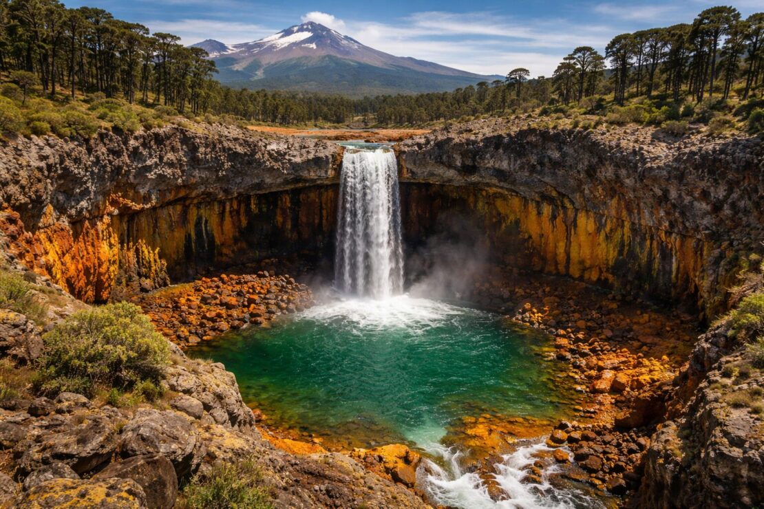 Na Patagônia Argentina o Salto del Agrio encanta visitantes com cores intensas e forte significado cultural Mapuche na província de Neuquén