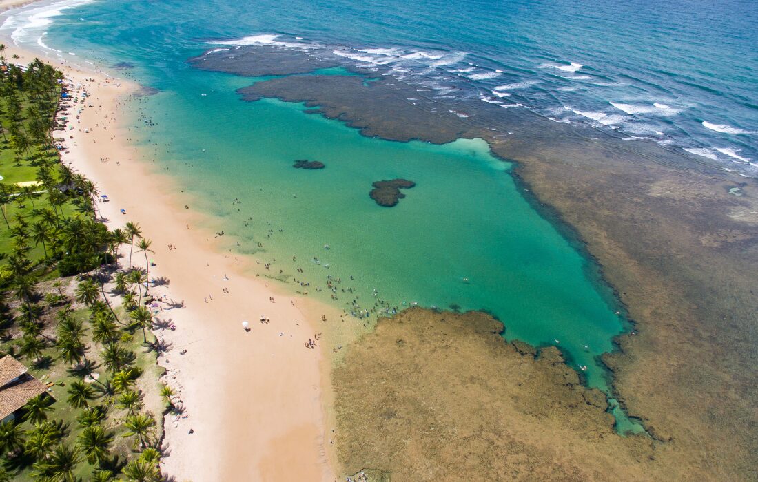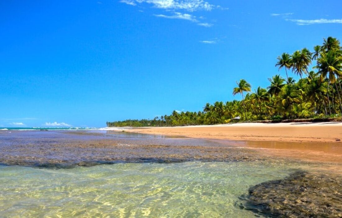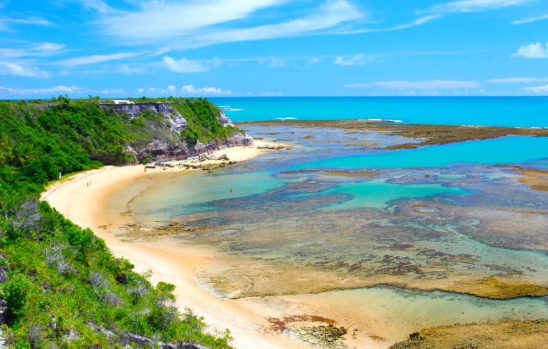 Entre Trancoso e Caraíva, a Praia do Espelho reúne mar protegido por recifes e formação de piscinas naturais na maré baixa. As falésias coloridas compõem a paisagem e a faixa de areia ampla facilita a circulação das famílias. Restaurantes e quiosques instalados ao longo da praia garantem suporte ao visitante.